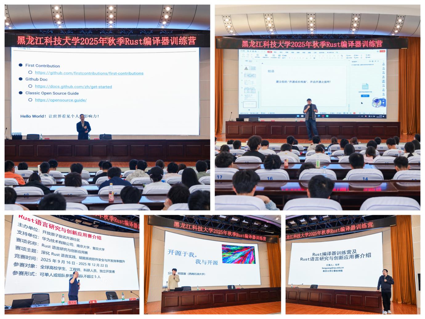 9月20日,由我院承办的2025年秋季Rust编译器训练营在学校信息报告厅顺利举办。本次活动作为CCF校园行黑龙江科技大学站的核心环节,特邀华为专家马全一、联想集团张文杰、南京大学汪亮、冯洋、北京科技大学韩晓阳、西南石油大学邢国富等行业专家和精英担任讲师,学院200余名学生参与培训。