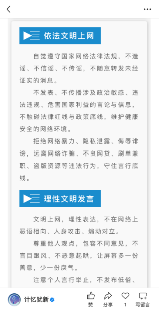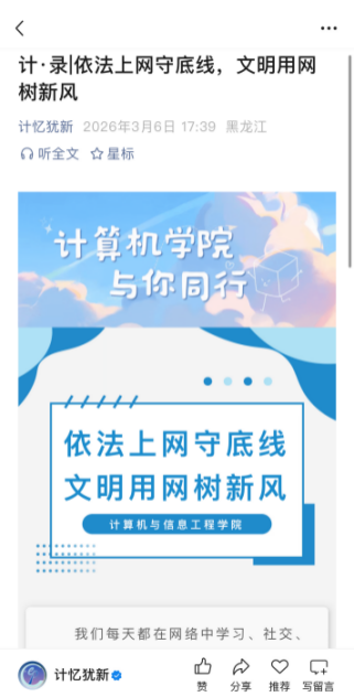 一是通过学院官方公众号“计忆犹新”,集中开展网络文明公约学习与警示教育专题推送。推文组织学生学习《新时代青少年网络文明公约》及网络管理规定相关内容,引导学生深刻认识依法上网、文明用网的重要性,自觉提升网络素养,共同营造清朗网络空间。